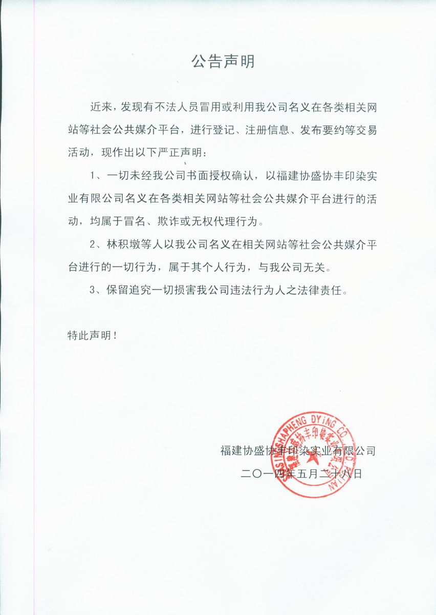 1、一切未經(jīng)我公司書面授權(quán)確認(rèn),以福建協(xié)盛協(xié)豐印染實(shí)業(yè)有限公司名義在名類相關(guān)網(wǎng)站等社會(huì)公共媒介平臺(tái)進(jìn)行的活動(dòng),均屬于冒名、欺詐或無(wú)權(quán)代理行為。
