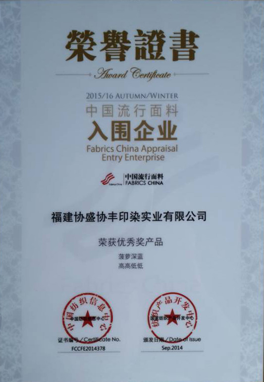 十月金秋,秋高氣爽,是收獲的好日子。協(xié)盛協(xié)豐也迎來了又一個行業(yè)專門獎項:兩個品種入圍2015/16 AUTUMN/ WINTER中國流行面料優(yōu)秀產(chǎn)品獎。這是我司連續(xù)多次獲得此殊榮,也與我司常年不懈創(chuàng)新追求的結(jié)果。