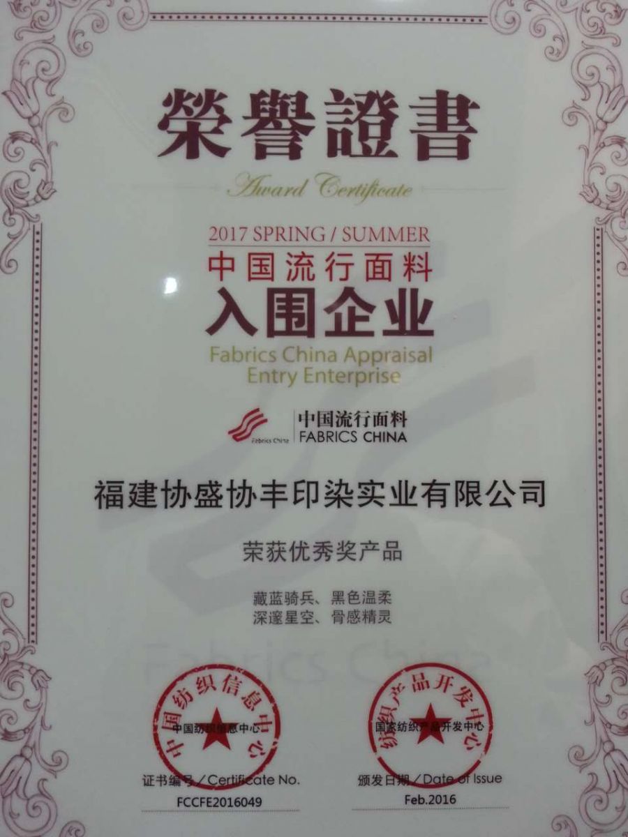 近日,協(xié)盛協(xié)豐的藏藍騎兵,黑色溫柔,深邃星空,骨感精靈等多款面料分別榮獲2017年春夏中國流行面料優(yōu)秀獎和中國印染優(yōu)秀面料獎。